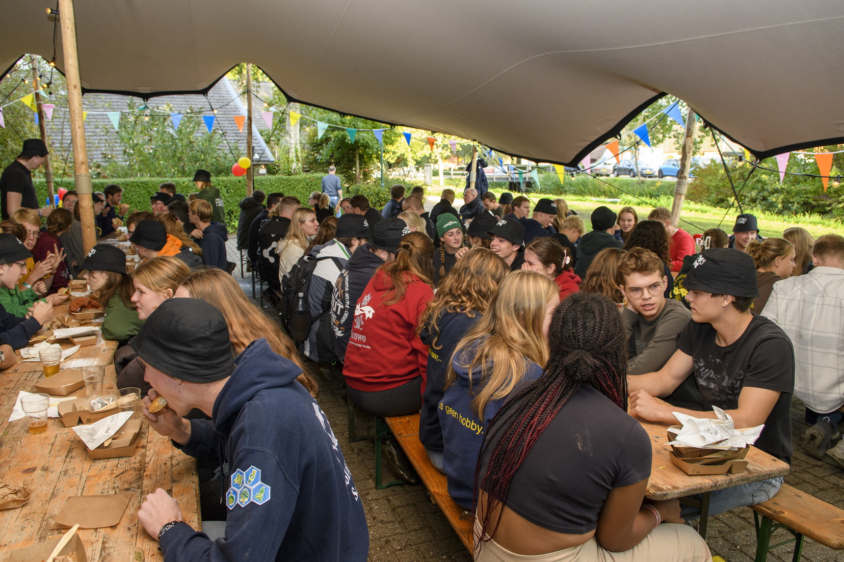 Om de honger die daaruit komt te stillen, stond de hele dag de foodtruck van Irene’s Catering klaar om jeugdleden te voorzien van Patat, Pizza en Pannenkoeken. ‘s Avonds werd voor de leiding daaruit een uitgebreid menu geserveerd. Dit was dé ingeleide voor een feestelijke avond met bandjes, bijpraten met oud-leiding en kaderleden, en meer silent disco. Uiteindelijk kon niet anders dan geconcludeerd worden dan dat de organisatie een fantastische dag heeft georganiseerd. Zelfs de regen kon het feest niet in het water laten vallen. De tomeloze inzet van de leiding, en het bezoek van de oud-leiding die het een ware reünie maakte, hebben daar aan zeker bijgedragen. Tenslotte heeft de sponsoring van T&S Klimaatechniek, H2o Installatietechniek, Van Dalsen Tentenverhuur, Smorenburg tuinen, Van Klingeren IA, Reclame plakkers, Flo Kortekaas, Multicopy, Yuverta & Joskine en het KUNSTPARK & Ben/ Marcha ook zeker geholpen.