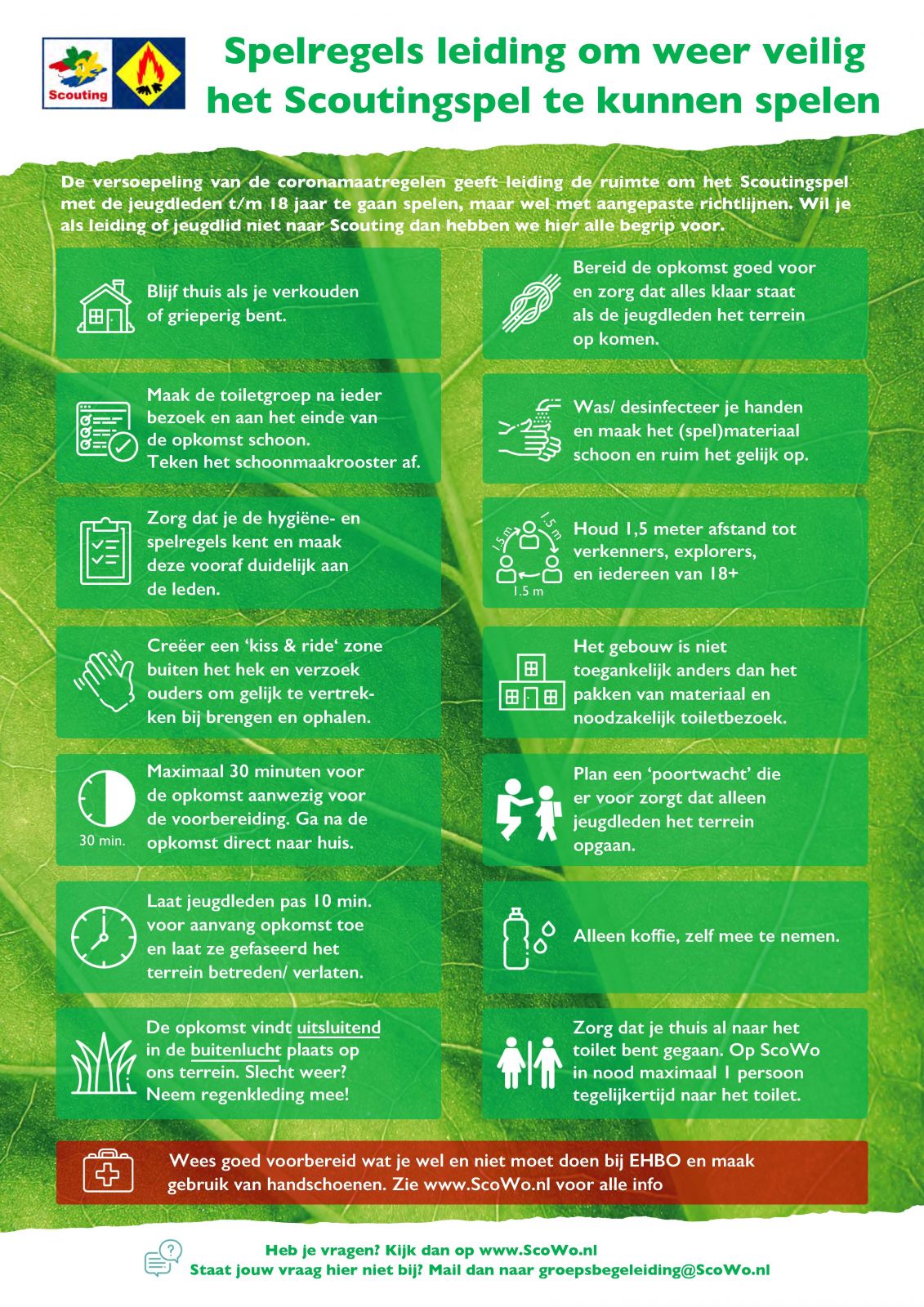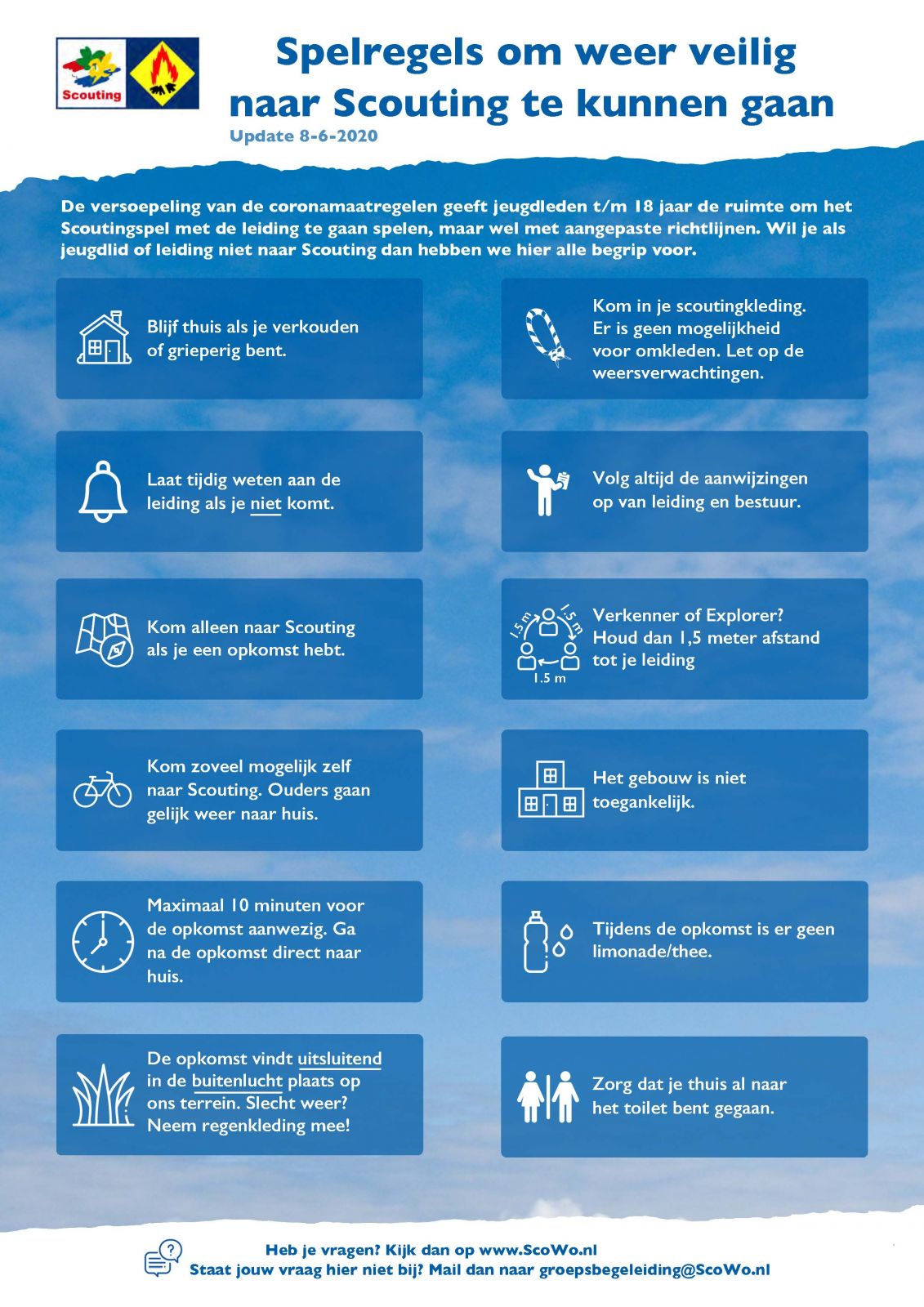 de gebouwen zijn niet toegankelijk. Voor alle afspraken die tijdens de opkomsten van kracht zijn, verwijzen wij naar de factsheets bij dit bericht (blauw voor leden, groen voor leiding). Al onze leden zijn hierover per e-mail geïnformeerd door het bestuur op 18 mei.